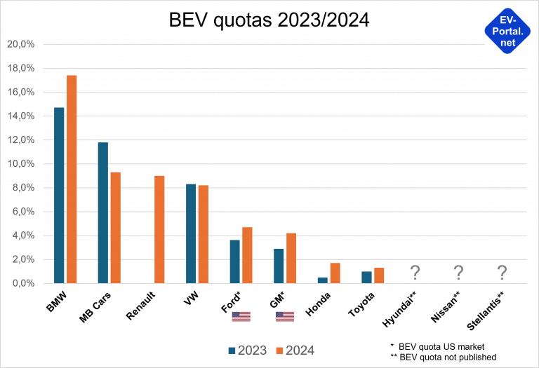 - The European manufacturers BMW, Mercedes–Benz, Renault and VW have already achieved a BEV quota of 8% or more of their vehicles sold worldwide in 2024.