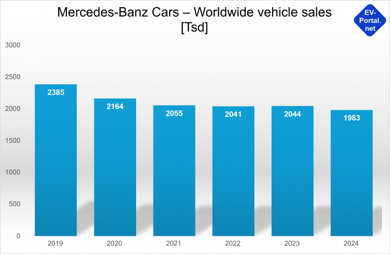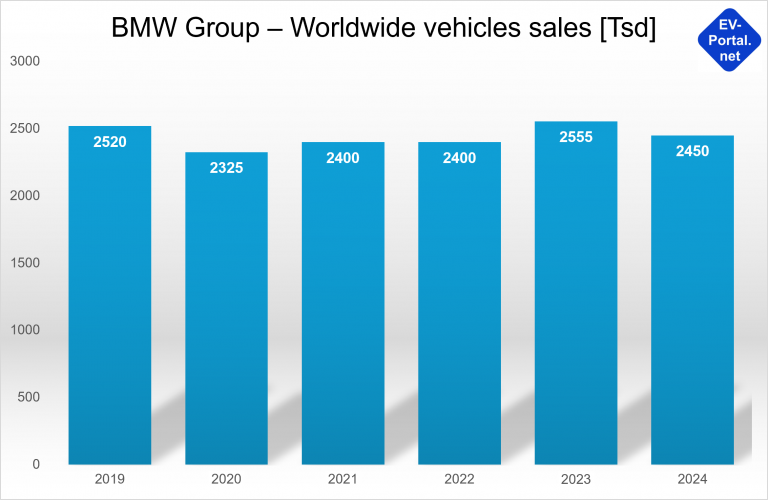 As a volume manufacturer, VW has been hit much harder by the current automotive crisis than the premium manufacturers BMW and Mercedes, which is also reflected in the sales figures for 2019 to 2024 (see chart):