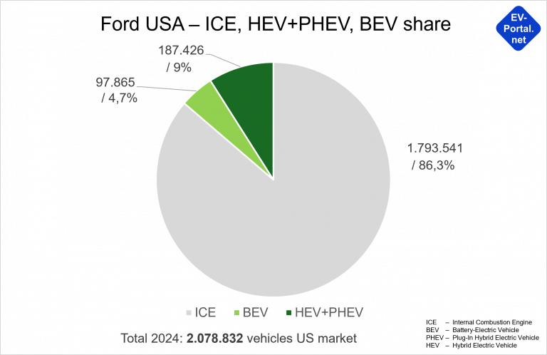 In 2024, Ford sold almost 100,000 BEV models on the US market, which corresponds to a 4.7% share of Ford’s total sales (see figure). The share of hybrids (HEV and PHEV) was 9%; unfortunately, Ford does not provide a precise breakdown of plug-in hybrids.