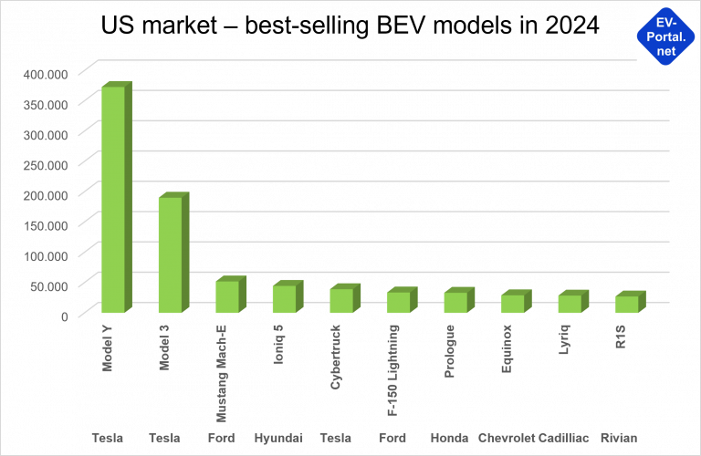 Unfortunately, Hyundai does not break down its sales figures by drive type. What is known, however, is that the Ioniq 5 will be the fourth best-selling BEV model in the USA in 2024, taking first place among non-US manufacturers (see figure).