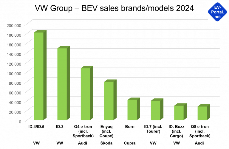 BEV distribution among brands and models in the VW Group in 2024